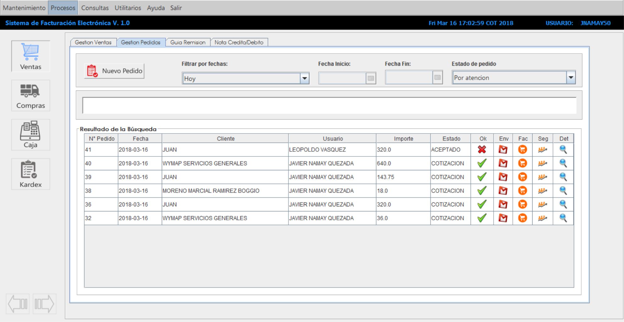 En este módulo se ingresa las cotizaciones que son elaboradas en base a una solicitud por parte de un cliente, este pedido puede pasar por varias etapas las cuales son: (cotización, pedido aceptado, facturado o rechazado), también podemos hacer seguimientos a estos pedidos registrando cada gestión (visita o llamada telefónica) realizada con el cliente, esta es una valiosa herramienta tanto para el vendedor como para el supervisor de ventas, pues permite hacer una gestión de ventas más efectiva. El pedido puede ser impreso y enviado por correo electrónico al cliente.